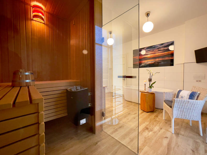 Auf Grund des idealen Grundrisses kann die große Ferienwohnung Strand-Idyll Family deluxe Spa für 4 (2x2) Personen in der Nebensaison auch als eine Suite deluxe Spa für 2 Personen oder als Suite deluxe für 2 Personen vermietet werden.