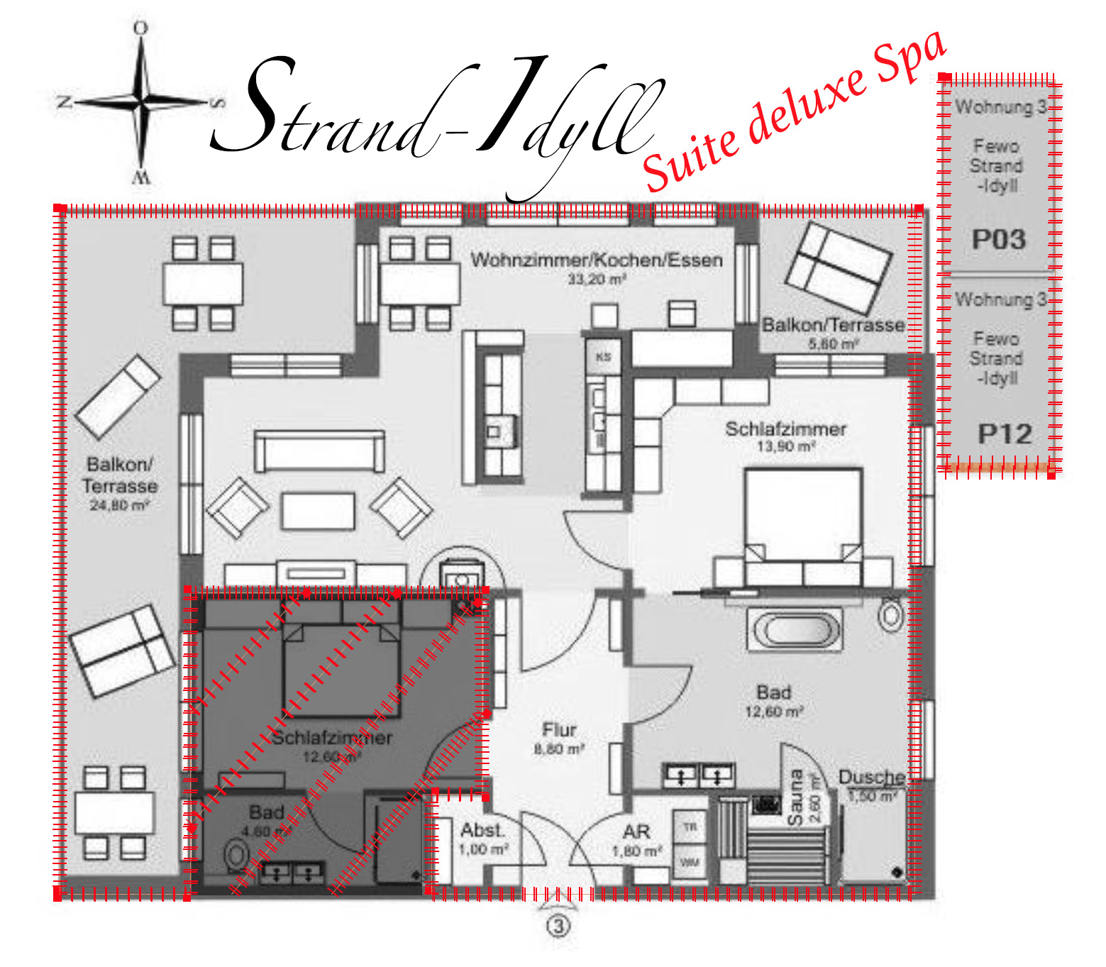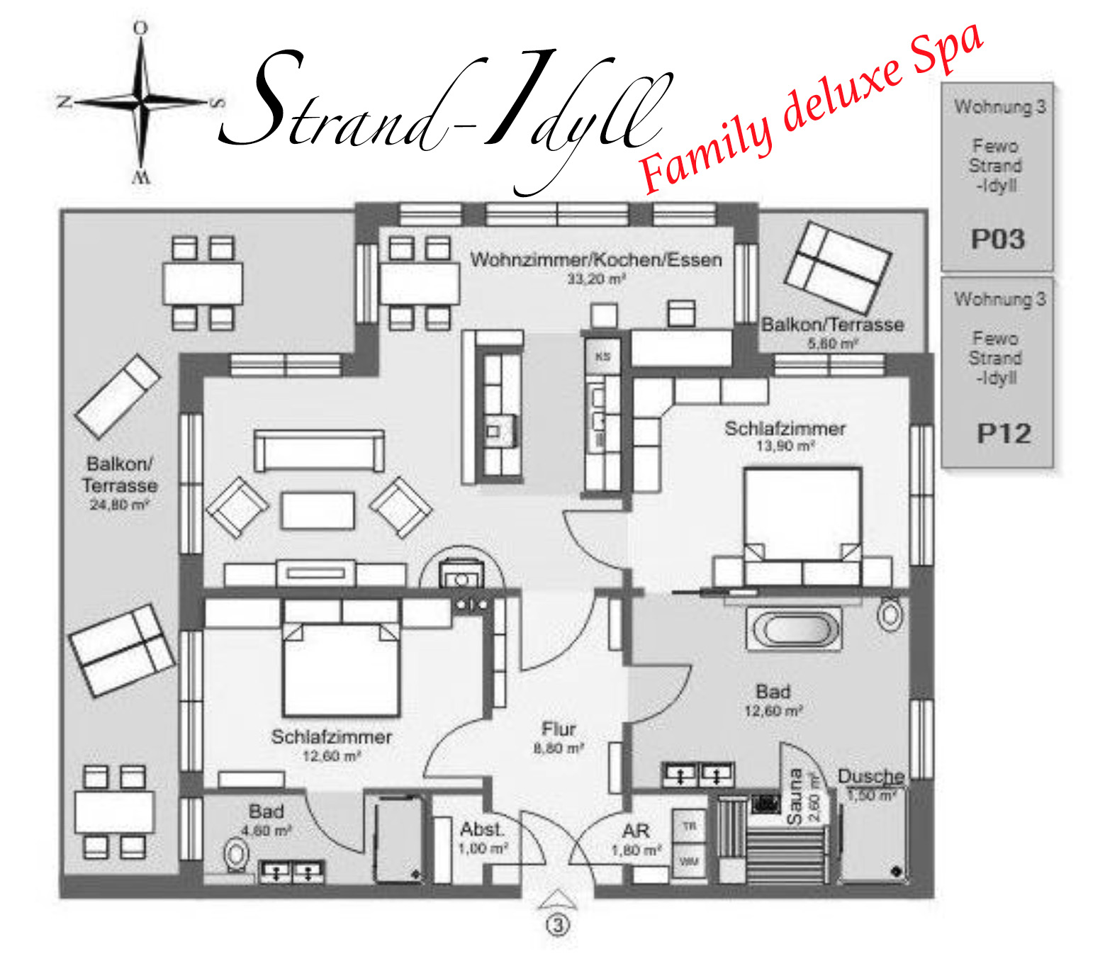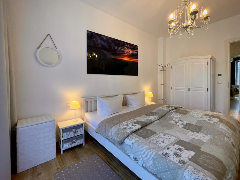 Auf Grund des idealen Grundrisses kann die große Ferienwohnung Strand-Idyll Family deluxe Spa für 4 (2x2) Personen in der Nebensaison auch als eine Suite deluxe Spa für 2 Personen oder als Suite deluxe für 2 Personen vermietet werden.